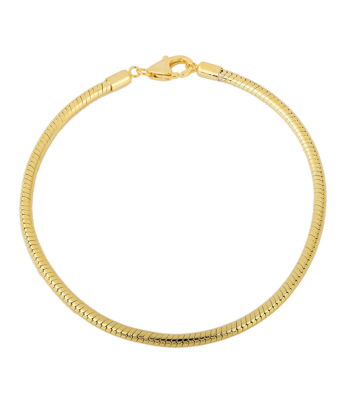 ˅Timeless and versatile, the Sleek Snake Chain Bracelet features a smooth, flexible design that fits comfortably around the wrist. Available in 18K gold-plated, this bracelet is perfect worn alone or as a base for your favorite charm collection.