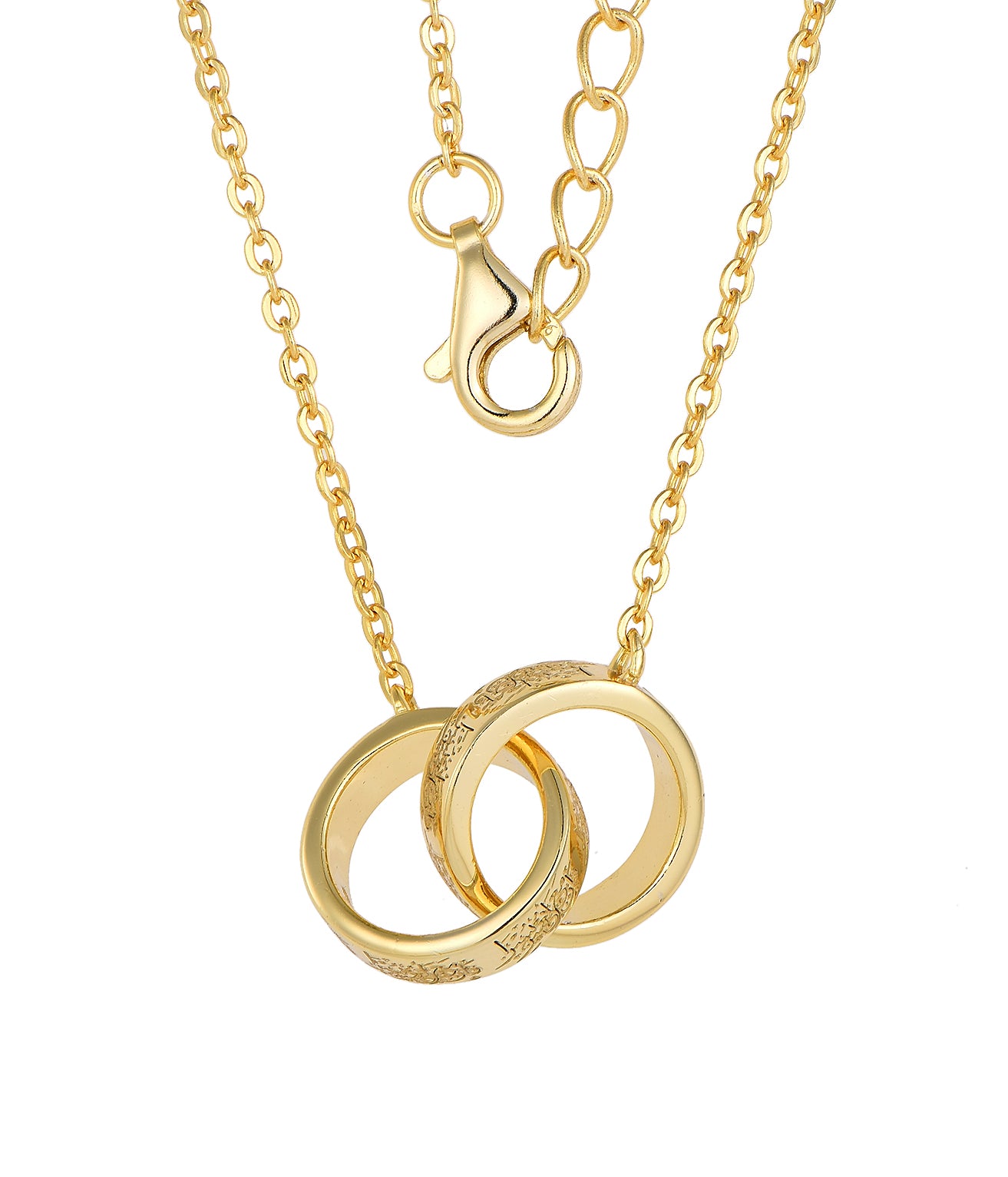 ˅This elegant Necklace features two interlocking gold rings — a timeless symbol of connection and balance — engraved with the powerful Quranic verse: